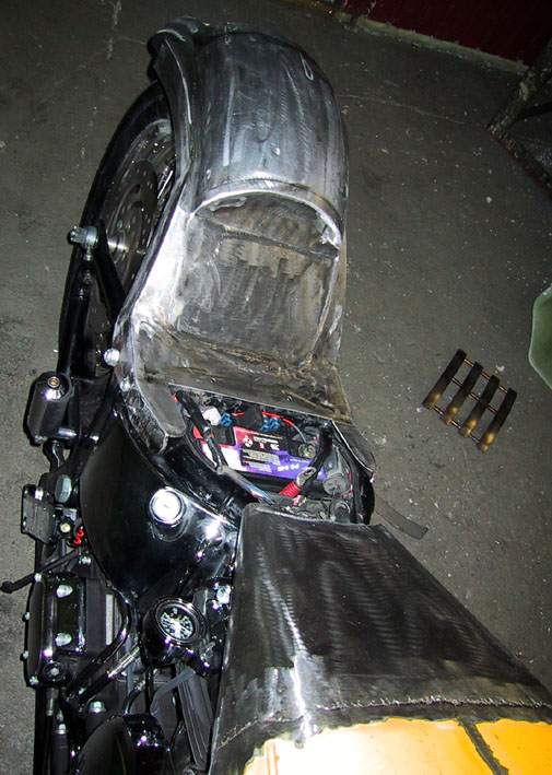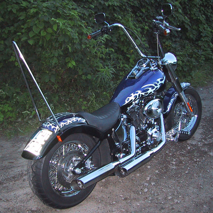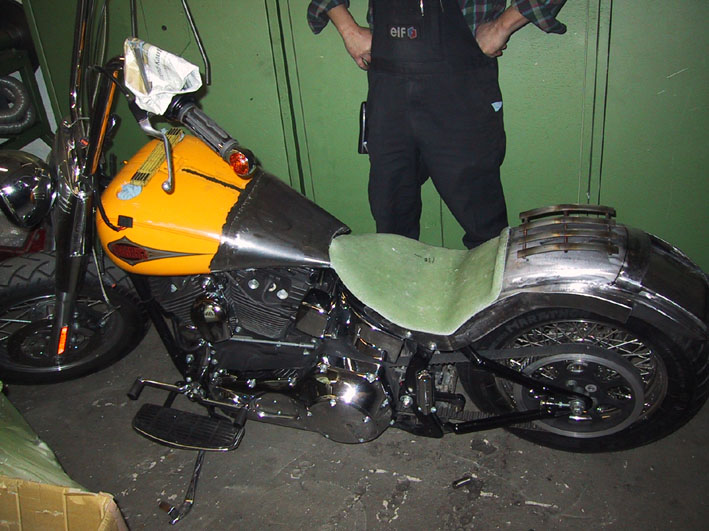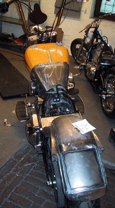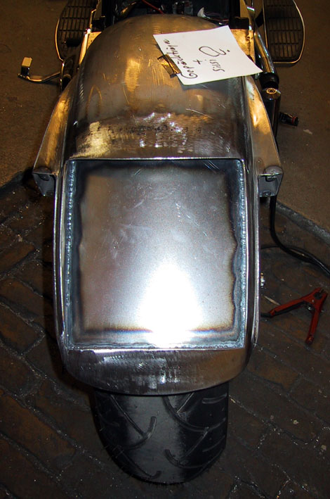 Nach meinen Vorstellungen aus Stahl angefertigtes Heckteil. Rück- und Bremslicht sowie Nummernschild integriert. Blinker an den Seiten eingelassen. Integrierte Halterung für die Sissybar.