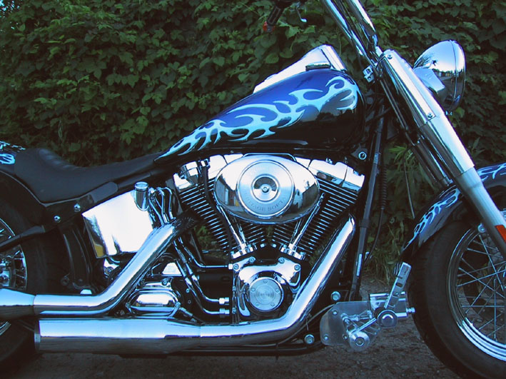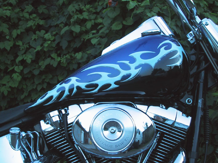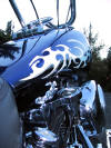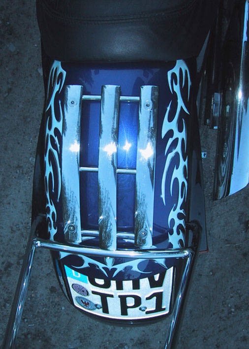 Die Tribals auf Front- und Heckfender und Tank entstammen einer frei verfügbaren Vorlage aus dem Internet. In Größe und Ausprägung wurden Sie vom Airbrusher entsprechend angepasst. Der stilisierte Tigerkopf befindet sich im Original auf meinem linken Unterschenkel, also Copyright by FONSO.